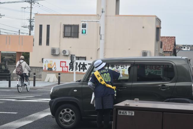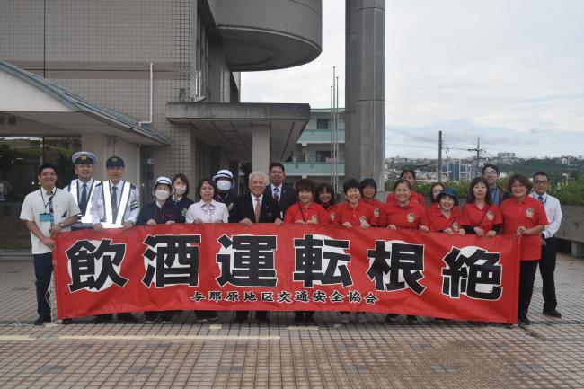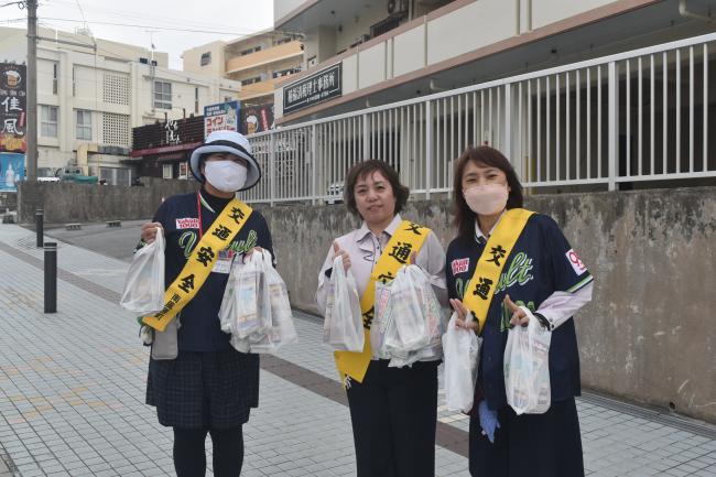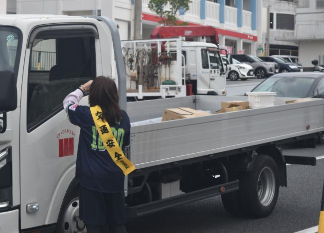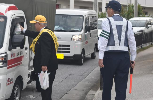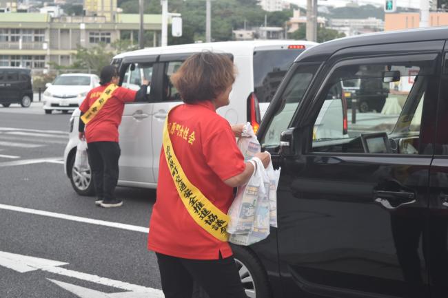 開始式では、赤嶺正之町長が「交通安全の意識を高め、事故のない安全な町づくりを」と挨拶。その後、沖縄ヤクルト株式会社、南風原町交通安全母の会、与那原警察署、与那原地区交通安全協会の協力のもと、参加者らが赤信号で停車中のドライバー 一人ひとりに「ミルミル」と啓発チラシを配布し、安全運転を呼びかけました。