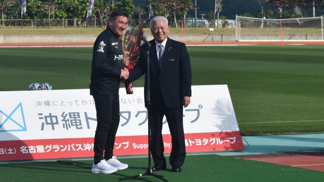 ↑赤嶺 正之 町長よりミハイロ ペトロヴィッチ監督へ花束の贈呈
