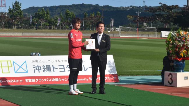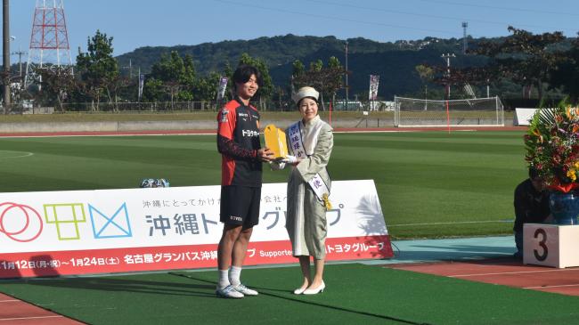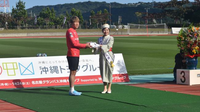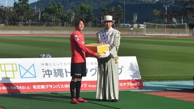 ↑琉球かすり大使 徳山 清歌 様より永井 謙佑 選手へリィコーチキンの若鶏の贈呈