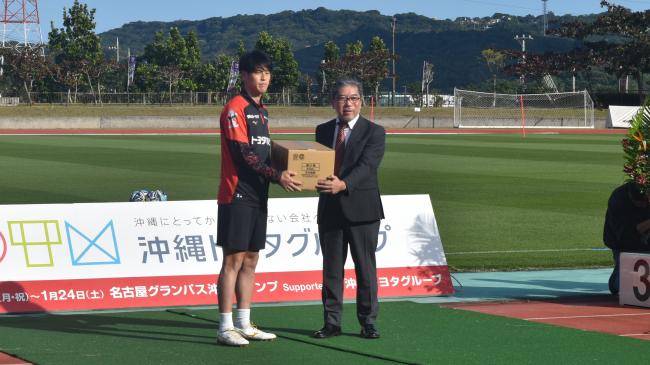 ↑琉球かすり大使 野原 万起子 様より藤井 陽也 選手へ美ら玉養鶏場パウンドケーキの贈呈
