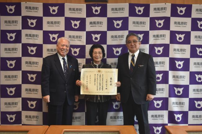 2月12日、元南風原町社会教育委員の上原弘子(うえはら ひろこ)さんが町役場を訪れ、「社会教育功労者表彰」受賞を報告されました。