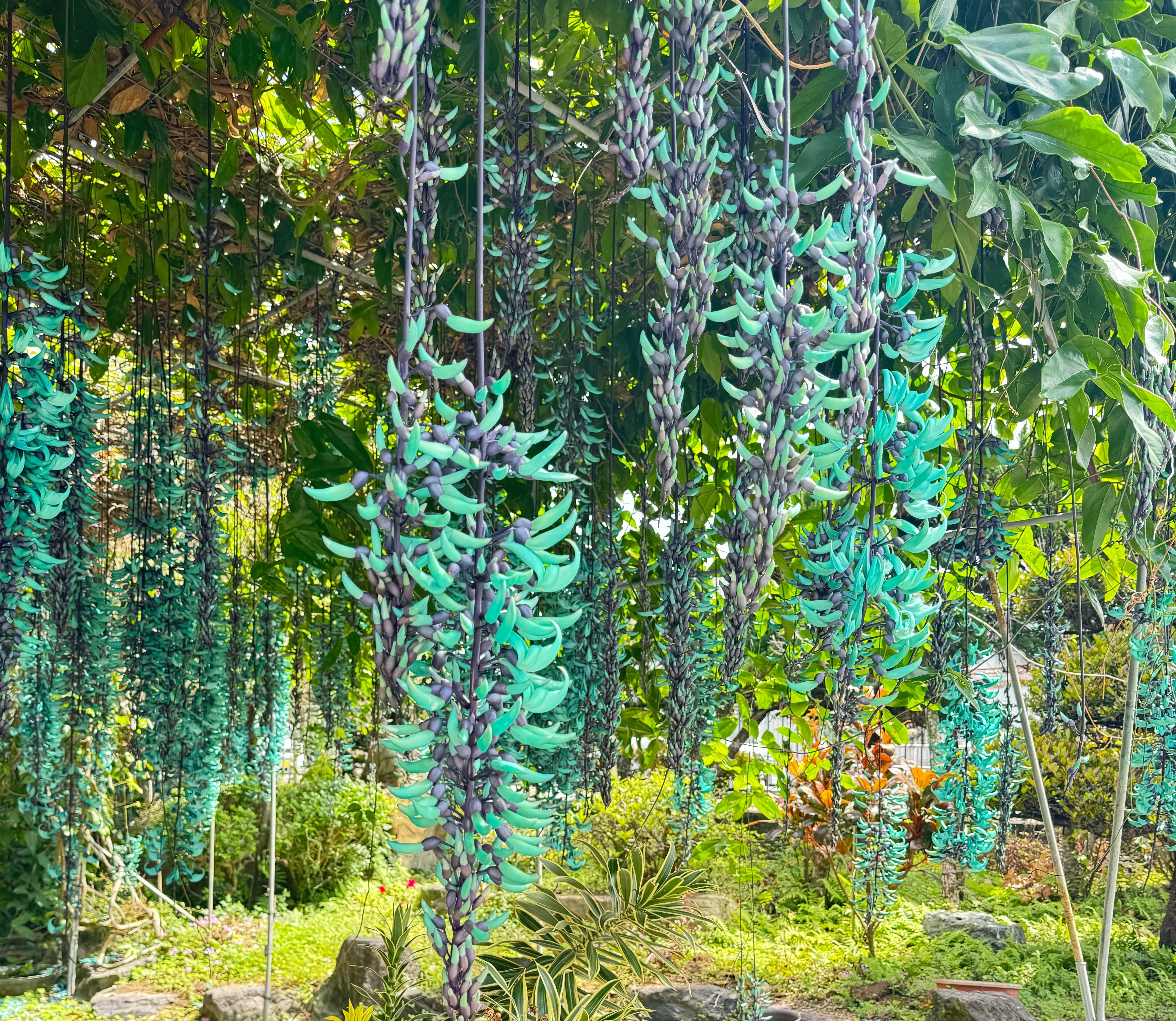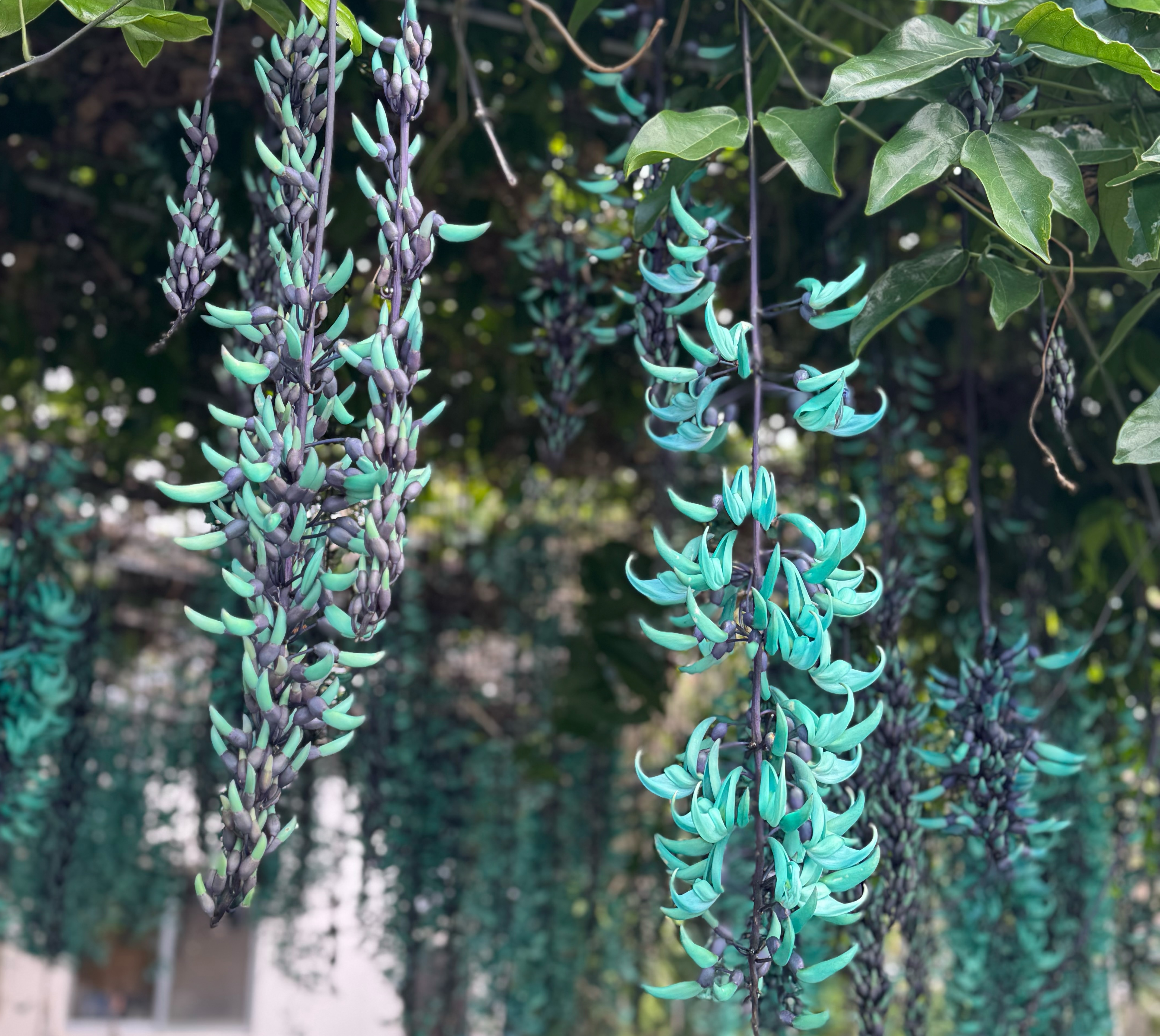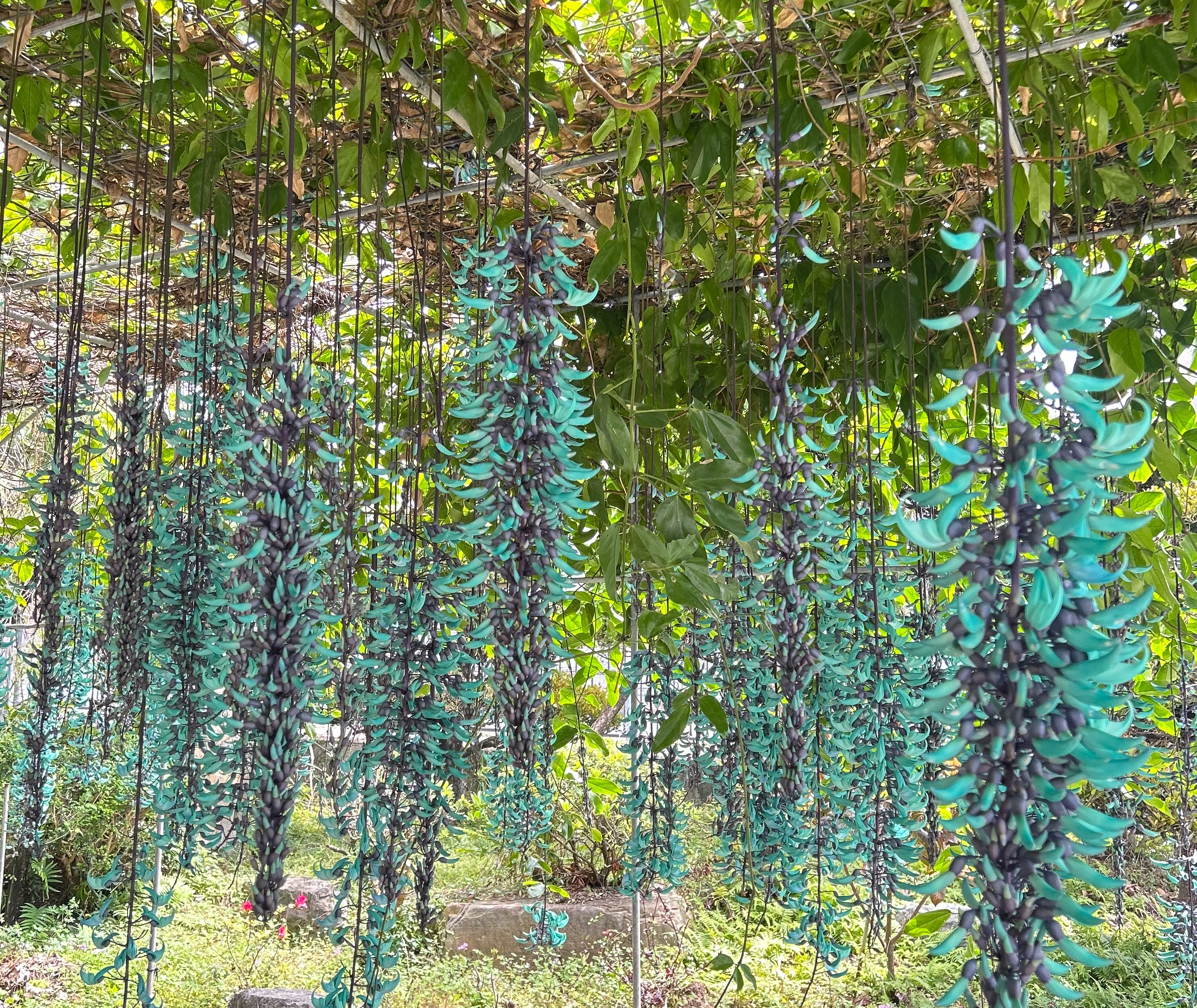 ヒスイカズラは、ツル性の植物で3月~5月頃が開花時期。花は翡翠色で美しい色彩で咲き、咲き誇った姿はまるで自然界のシャンデリアのよう。